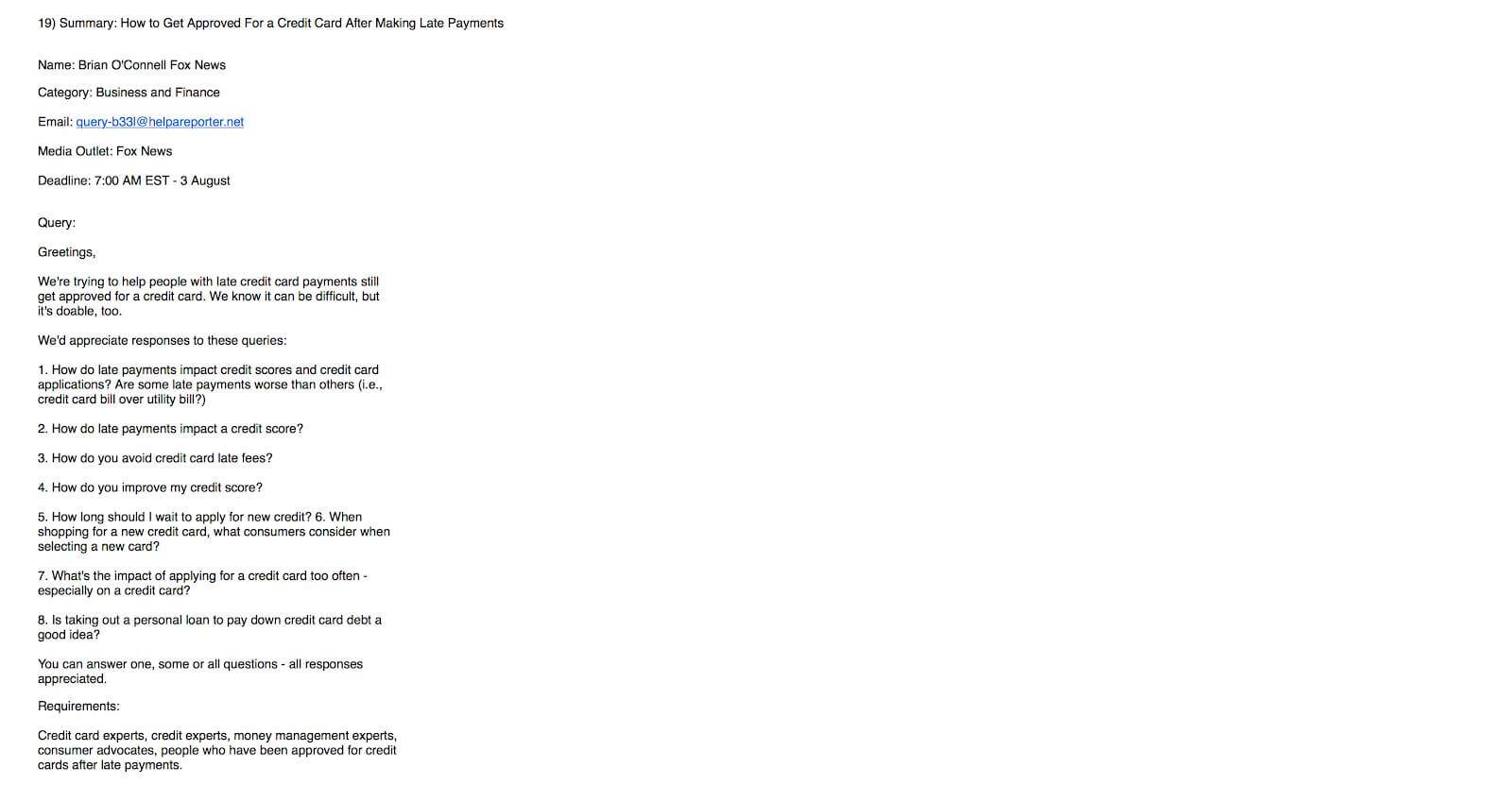 Once you click on a link in the HARO email, you will see the query more in-depth, including requirements and what kind of info the journalist needs. For example, that’s how the Fox News link looks like when you click on it: