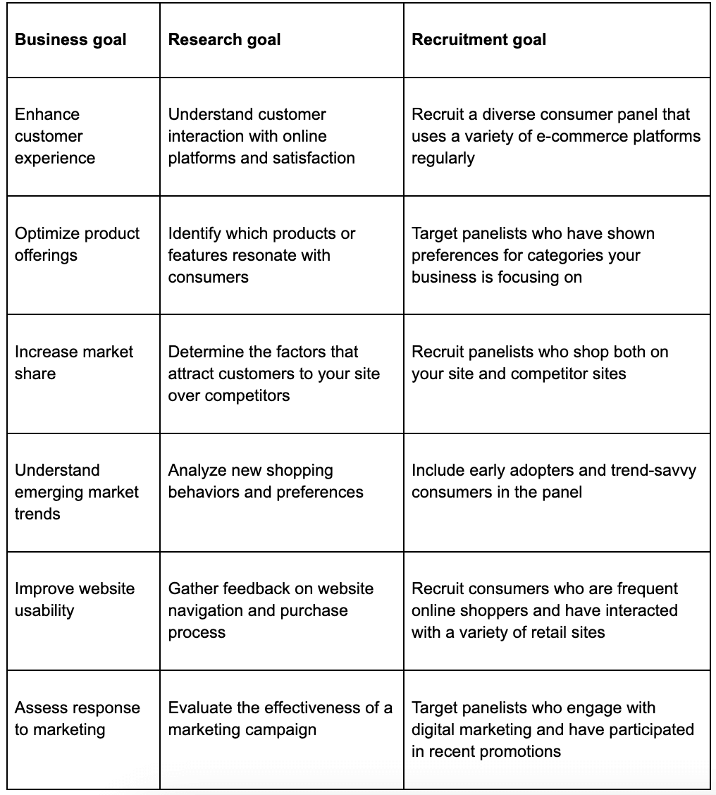 Insider tip: Review the table to identify your business objective. Then, follow up the corresponding research and recruitment goals to formulate accurate objectives for your upcoming panel of customers.
