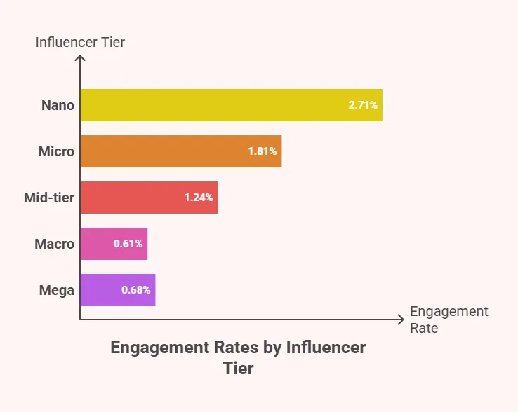 Engagement data consistently shows that nano and micro influencers generate higher engagement rates than macro creators. Nano influencers average 2.71% engagement, while micro influencers average 1.81%. That’s why we usually suggest leaning into smaller creators when engagement is a priority.