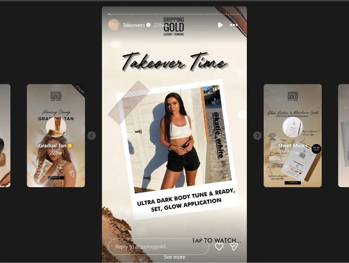 Example: Tanning and beauty brand Dripping Gold regularly hosts influencers to take over its Instagram Stories. They demonstrate how to use the brand’s products to achieve the perfect tan or makeup look. Because Stories are ephemeral, Dripping Gold preserves these takeovers by pinning them to a dedicated “Takeovers” highlight.