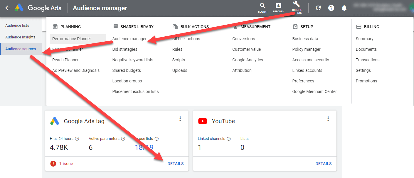 In the Google Ads dashboard, go to “Audience Manager” and create custom segments.