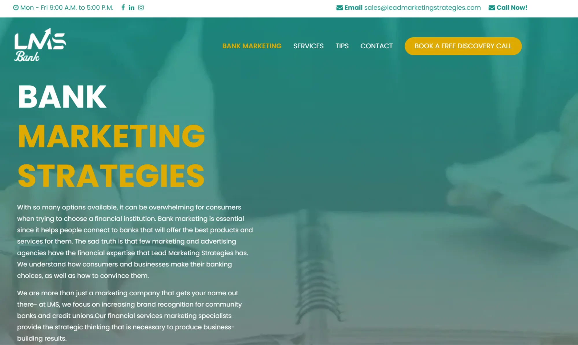 Their service suite spans SEO, PPC, content marketing, email automation, website design, local listings, and social media, all delivered through a banking-first lens.
