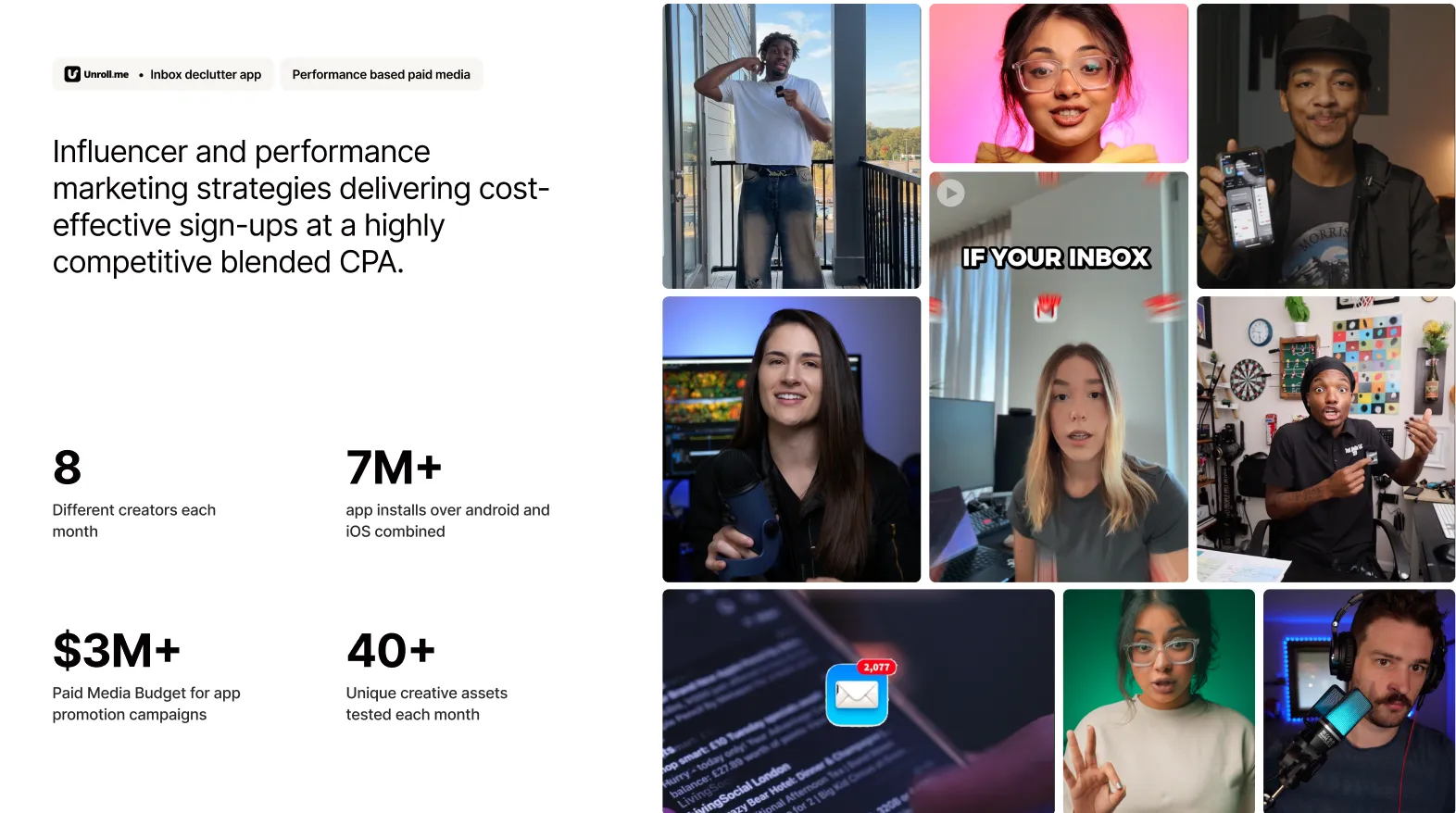 A standout example comes from their work with Unroll.me, where influencer and performance marketing really shone. inBeat collaborated with 8 creators per month, testing 40+ unique creative assets.