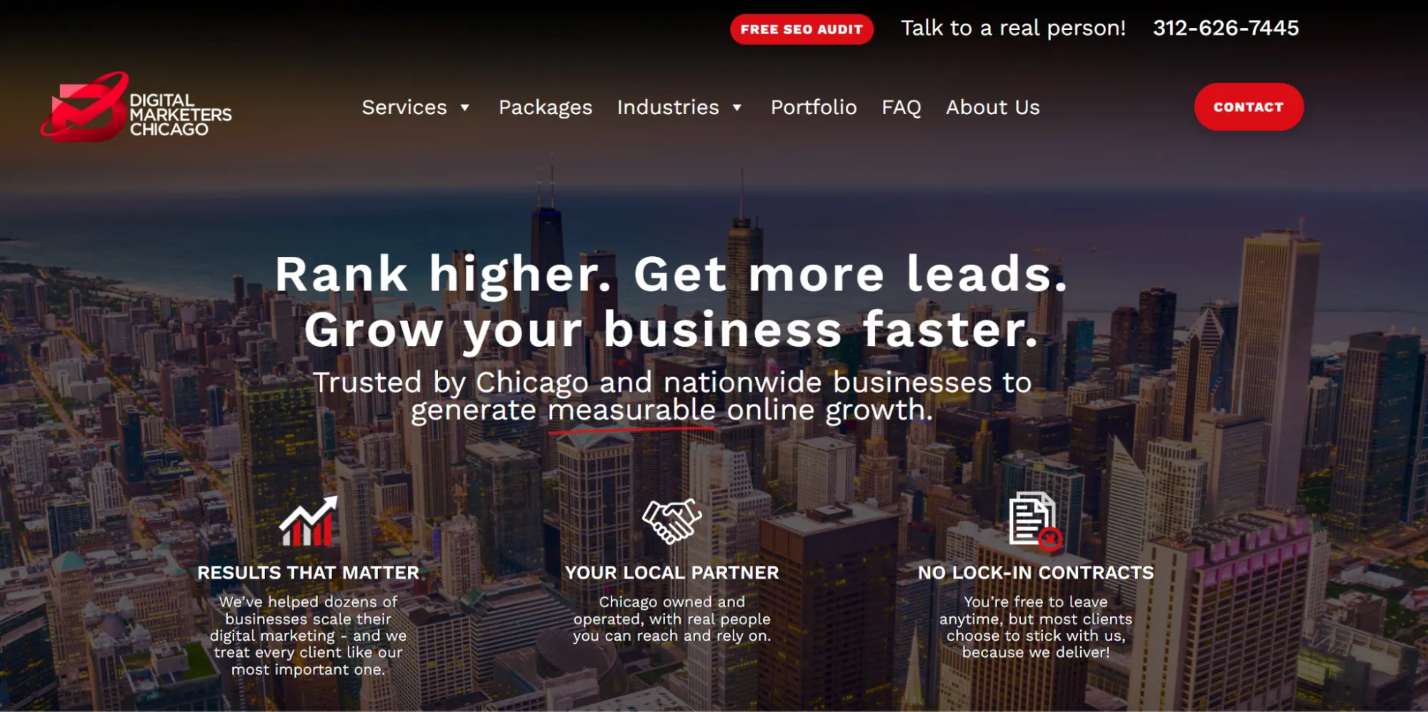 5. Digital Marketers Chicago: Flexible, full-service agency with no long-term contracts. They focus on quick, scalable results across SEO, web dev, and paid media, delivering significant traffic and revenue growth.