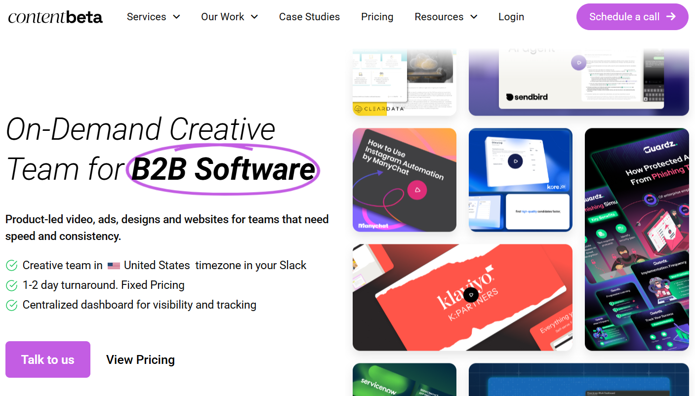 Content Beta works well for healthcare teams that need consistent, on-brand video and design output, without hiring full-time creatives. They run on a subscription model, giving B2B marketing teams access to an on-demand crew of designers, motion artists, and video editors. A dedicated creative director manages everything.