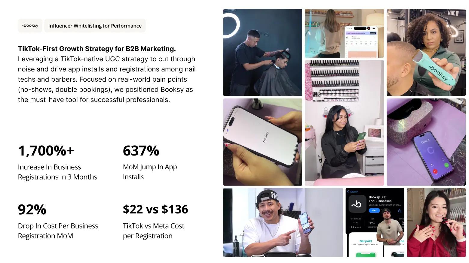 By leaning into TikTok-native user-generated content and zeroing in on real-world pain points like no-shows and double bookings, inBeat drove a 1,700% increase in business registrations in three months, a 637% month-over-month jump in app installs, and a 92% drop in cost per registration month-over-month.