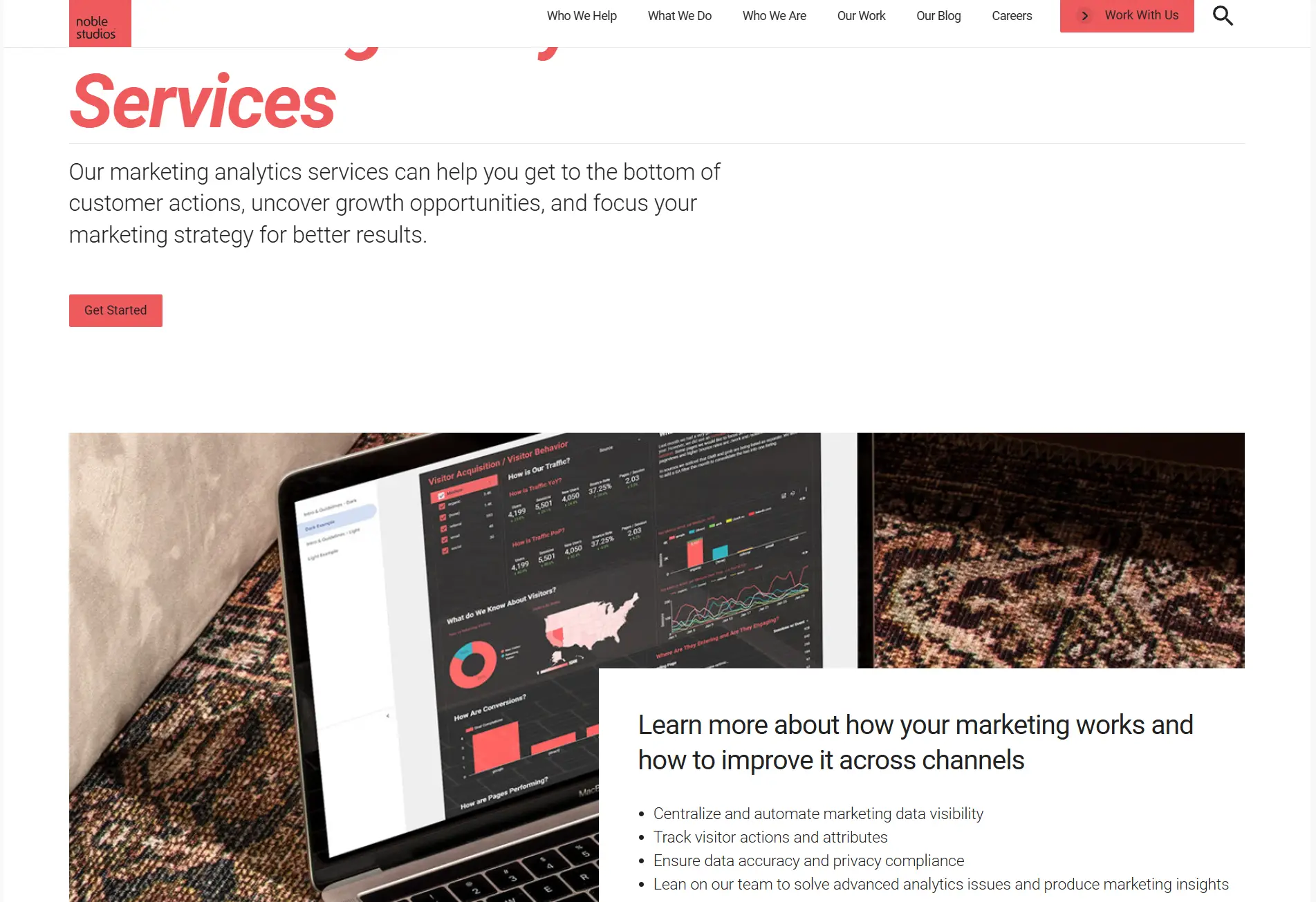 5. Noble Studios: Noble Studios excels at uniting storytelling and analytics. They centralize marketing data into real-time dashboards and layer it with custom tracking, compliance, and privacy controls. Their creative and analytics teams collaborate on cross-channel campaigns that are both brand-aligned and performance-optimized.