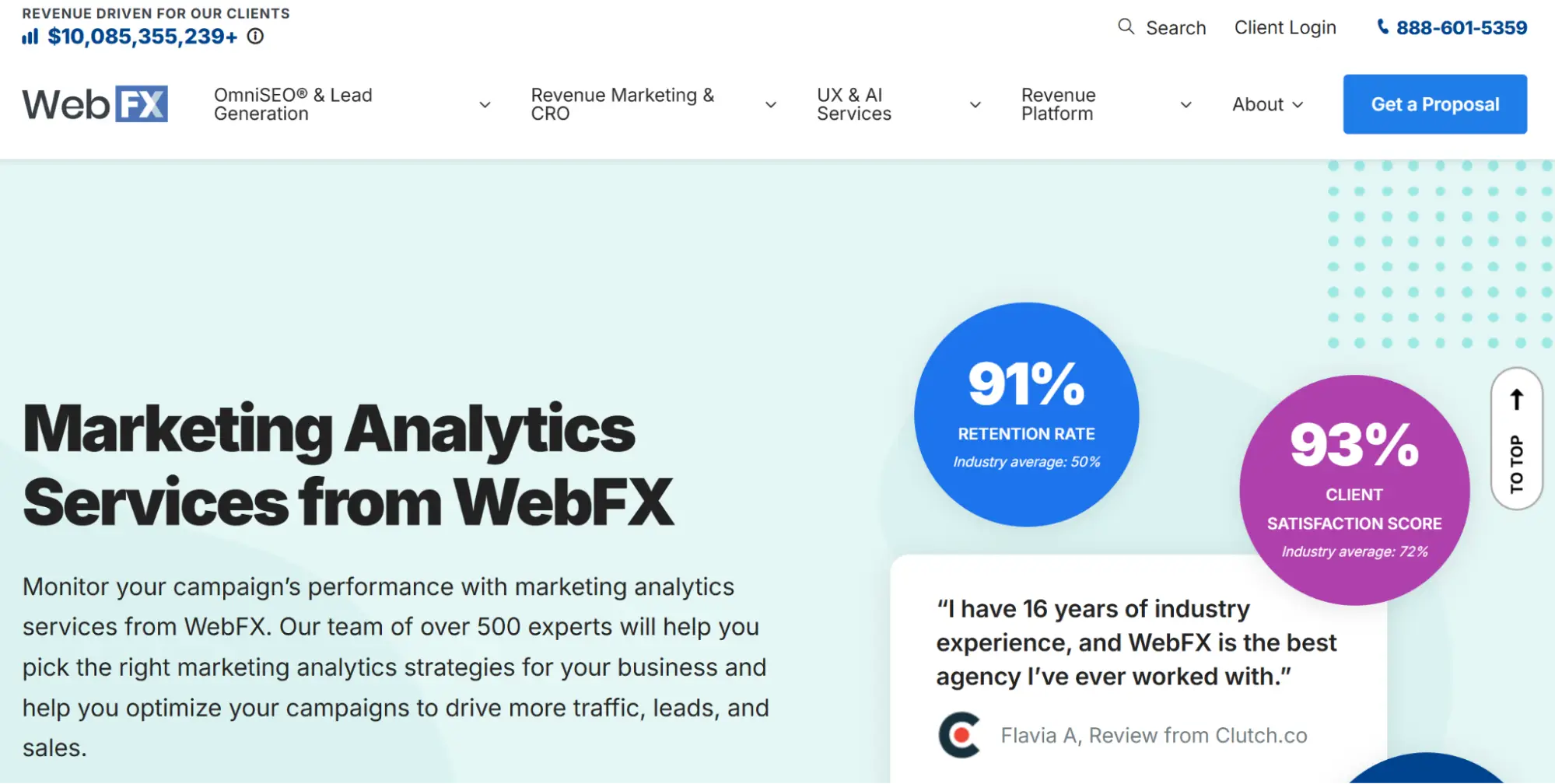 WebFX delivers analytics at scale with a team of 500+ digital specialists and a full-stack offering that covers GA and eCommerce tracking, CRO, PPC and social ad performance, audience segmentation, dashboards, and ROI forecasting.