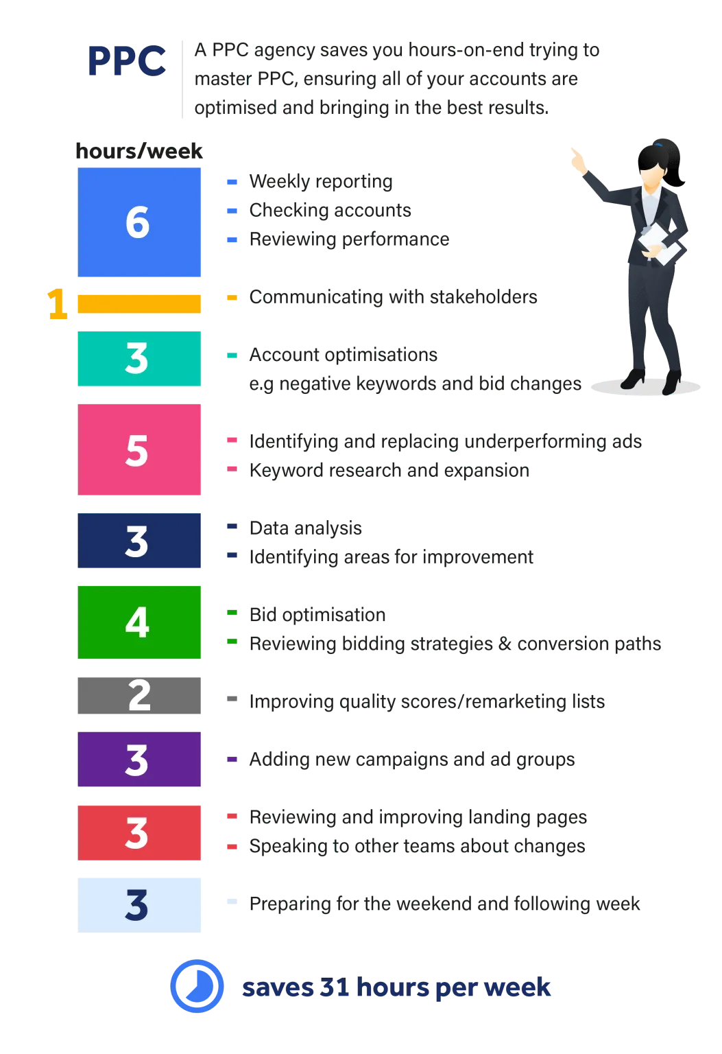 Partnering with a NYC-based PPC agency frees your internal team to focus on core business activities like product development, customer service, and strategic planning. One analysis found that working with a PPC agency can save 31 hours per week.