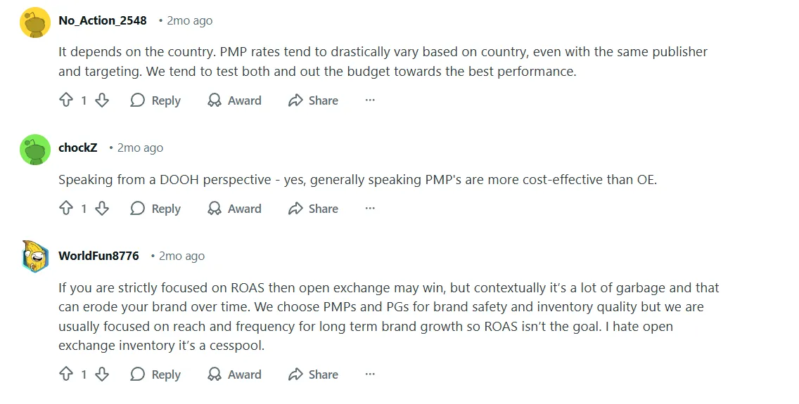 Of course, opinions are mixed: performance varies by country; some say PMPs outperform open exchange on cost and quality, while others prefer open exchange for ROAS despite brand safety concerns.
